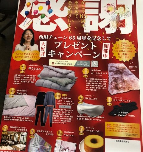 感謝祭 2025.12.1 Tweet Share Hatena Pocket RSS feedly Pin it 西川チェーン65周年の感謝祭を開催しています。 65000円以上お買い上げの方に抽選で 豪華景品が当たります。 是非ご利用くださいませ。 期間は12/30までです。 ご来店をお待ちしております。 では又・・・。 Tweet Share Hatena Pocket RSS feedly Pin it 12月営業カレンダー前の記事 ふとん丸洗い本年終了次の記事